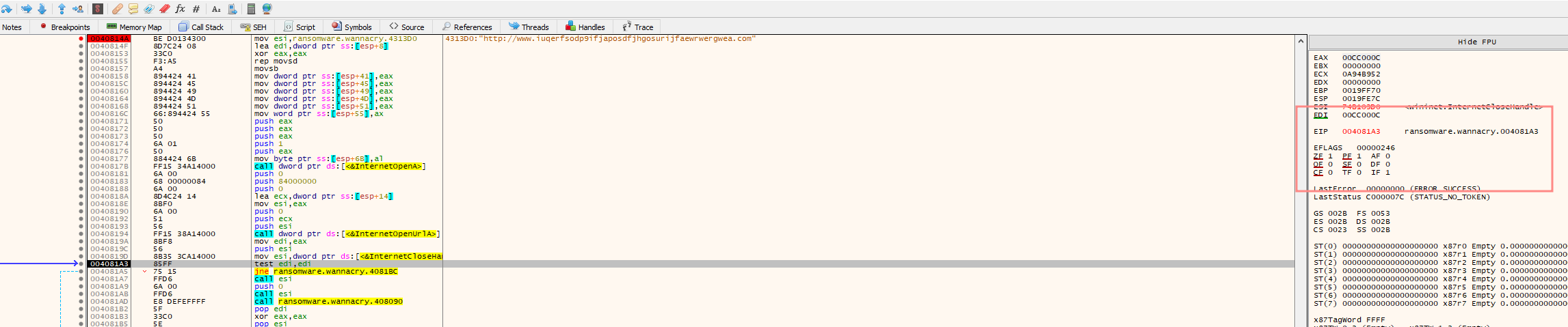 InternetOpenUrlA tests the connection to www.iuqerfsodp9ifjaposdfjhgosurijfaewrwergwea.com using the call: