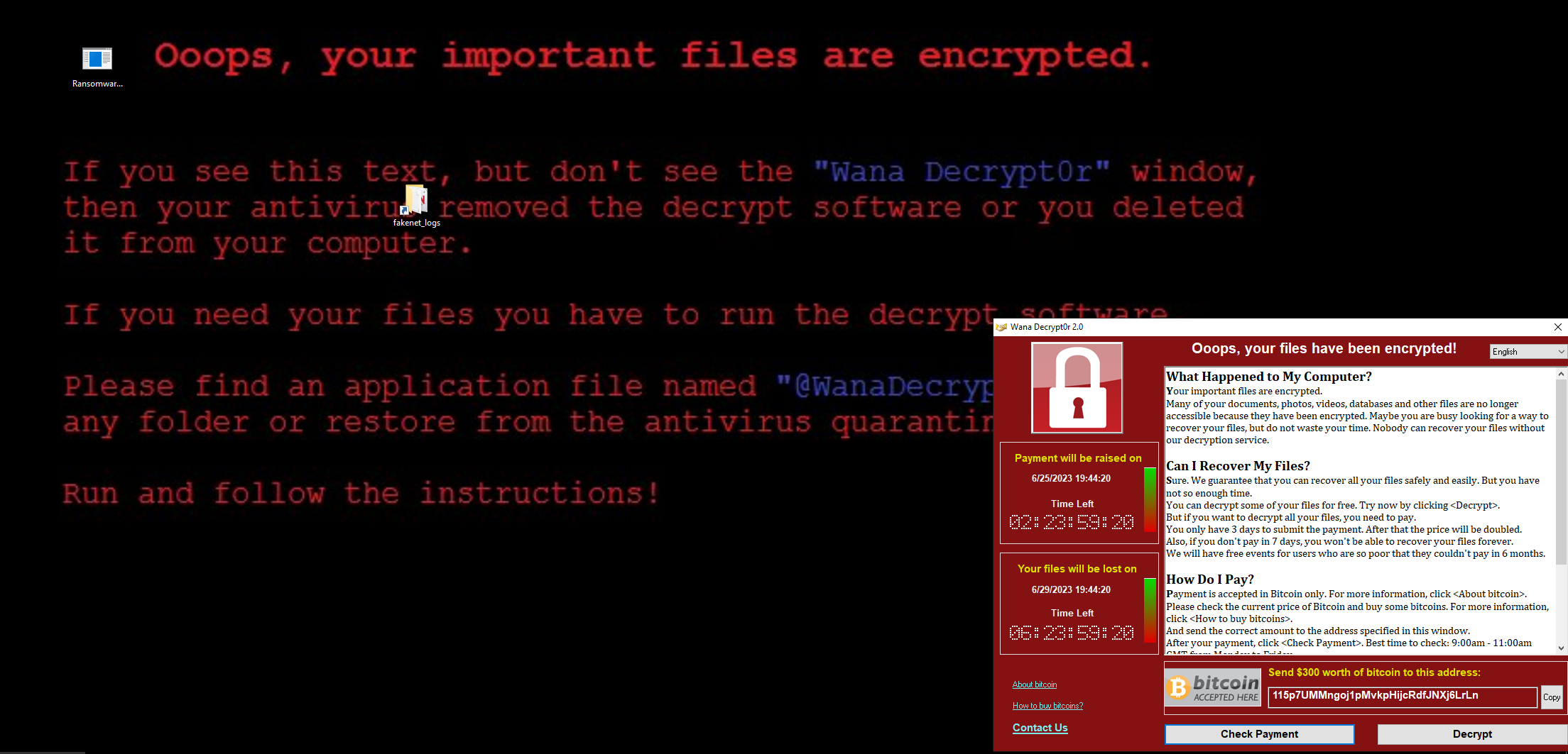 WannaCry.exe is ransomware that appeared in 2017. It consists of one executable that contains several other binaries in it. Once executed with Administrative privieges, the ransomware begins encrypting the files on the victim’s storage. WannaCry also attempts to reach out to other hosts on the netork via SMB and attempts to infect them. Once infected, the host will begin seeing a changed background and message dialog alerting them that their files have been encrypted and where they can send payment if they want them decrypted.